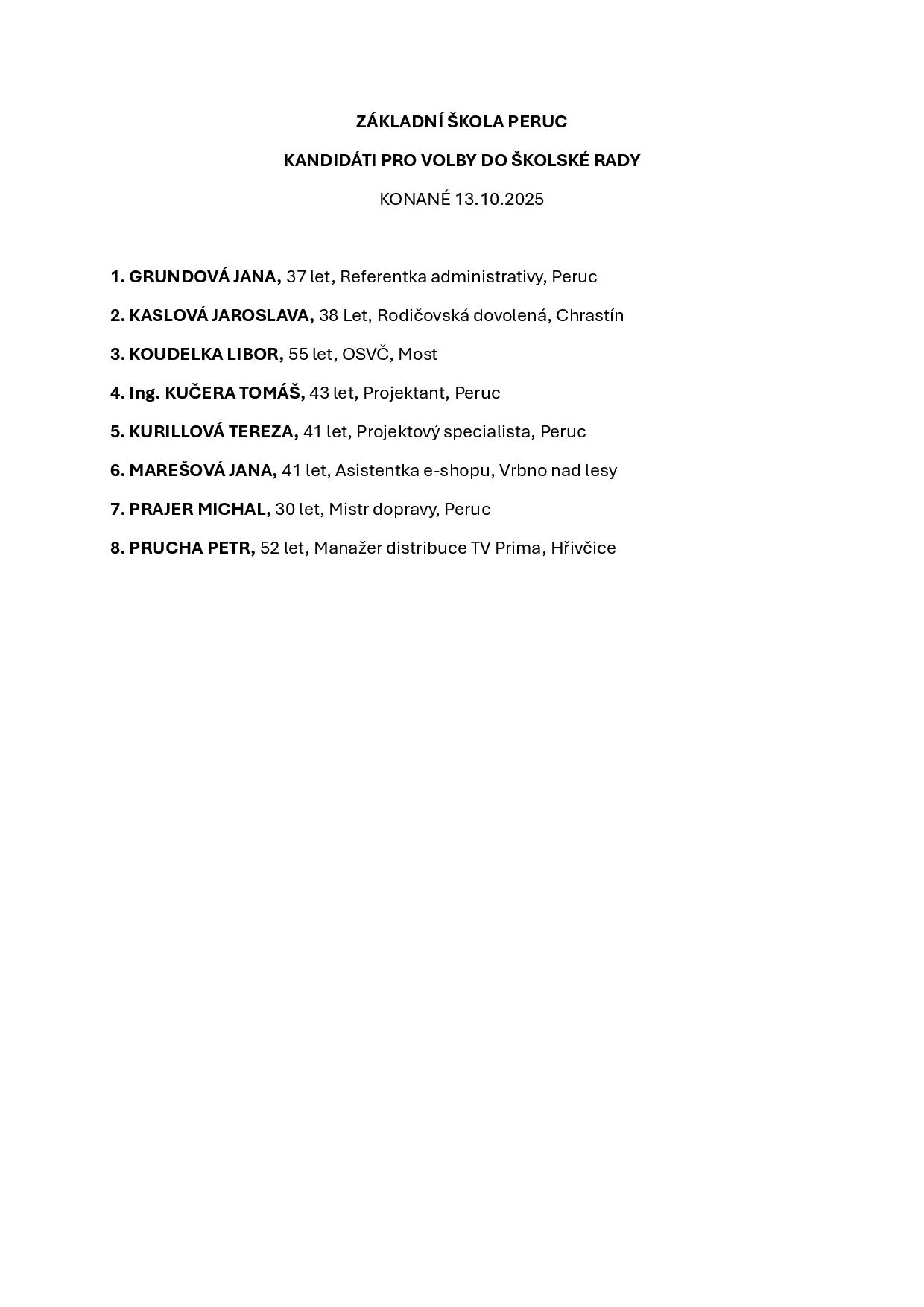 dovolujeme si Vás pozvat k volbám do Školské rady Základní školy Peruc, které se uskuteční dne 13. října 2025 v čase od 16:30 do 18:00 v budově školy (Jídelna).
